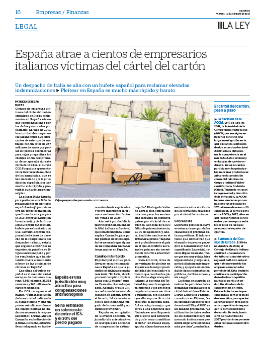 Il 30 novembre 2023 è stato pubblicato su El Paìs, cinco dias economia sezione Legal un articolo dedicato all’azione risarcitoria in Spagna organizzata dal funder ALI Antitrust Litigation Investment a favore delle imprese italiane danneggiate dal cartello del cartone ondulato.